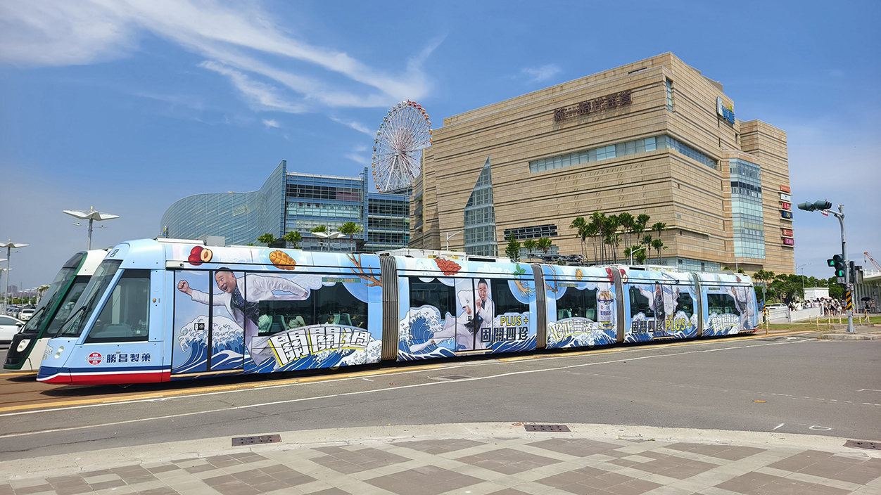 迎接暑假出遊、逛街人潮,中藥大廠勝昌製藥首次「搭」上高雄輕軌,顛覆外界印象,在車體融入海浪、四珍草本與品牌代言人「邰哥」邰智源的活力形象,十足吸睛,也傳達出品牌守護國民健康、與城市同行的理念。
