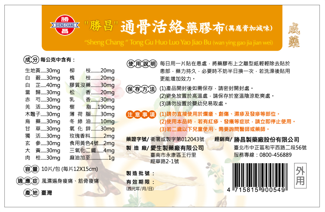 '勝昌'通骨活絡藥膠布(萬應膏加減味) |